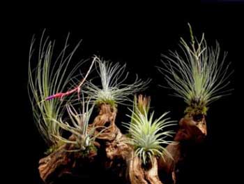 vivent suspendues, légères et élégantes, et offrent un scène aérien très beau berçées par la majorité des vents. Leur perfection s'accroit au moment de la floraison quand la partie de leur feuillage se rougis pour mieux attirer les pollinisateurs! Tillandsia cyanea et lndenii, à fleurs bleues, sont les plus fréquemment vendus en pot. Tillandsia usneoides, la 'barbe du vieillard' appelé pareillement 'Mousse espagnole', est le plus surprenant avec son enchevêtrement de tiges argentines qui poussent et de plus sans terre.